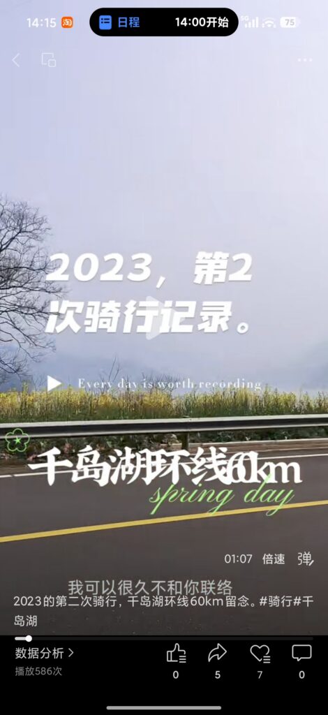 第二次是2023年的2月,约上WJ、LGX和他对象LD,四人一起绕湖骑行。我骑自己的大行P8折叠车,他们三人在本地车行租了山地车。我们穿过千岛湖大桥,完成了一条约65公里的小环线。春风拂面,湖光潋滟,一路说说笑笑,身体虽累却额外尽兴,那会儿还专门发了1个视频号。