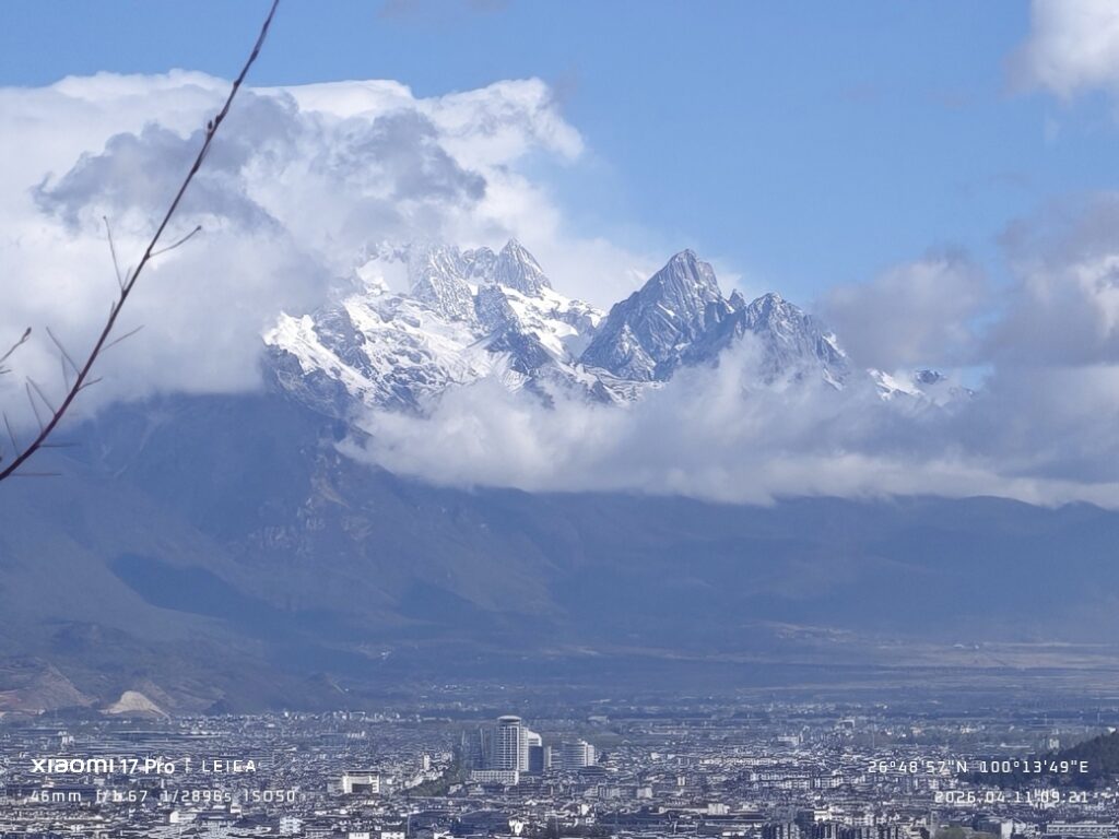 从丽江驶向大理的路上,在丽江南收费站附近(坐标:26°48’57.0″N, 100°13’49.0″E),我偶然抬头,一眼望见玉龙雪山在晨光中静静矗立,山脚下的丽江清晰可见。那一刻,心被狠狠击中。